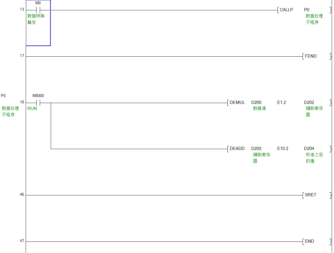 舉例說(shuō)明:某工程項(xiàng)目中,需要對(duì)多組數(shù)據(jù)進(jìn)行如下處理:D204=D200*1.2+10.2;D200為輸入的待處理數(shù)據(jù),D204為處理完成后的數(shù)據(jù)值。M0為進(jìn)入處理程序的觸發(fā)條件。