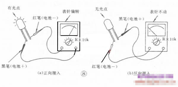 測(cè)試發(fā)光二極管的好壞,可以按照測(cè)試普通硅二極管正反向電阻的方法測(cè)試。指鐘式萬用表撥在R*100或R*1K檔,用黑表筆接發(fā)光二極管正極,紅表筆接負(fù)極,測(cè)得正向電阻應(yīng)在20=40K;用黑表筆接發(fā)光二極管負(fù)極,紅表筆接正極,測(cè)得反向電阻應(yīng)大于500K以上。用數(shù)字式萬用表撥在二極管檔,黑表筆接發(fā)光二極管正極,紅表筆接負(fù)極,阻值為無窮大。黑表筆接發(fā)光二極管負(fù)極,紅表筆接正極,發(fā)光二極管會(huì)有微亮,表示正常。測(cè)式方法如圖