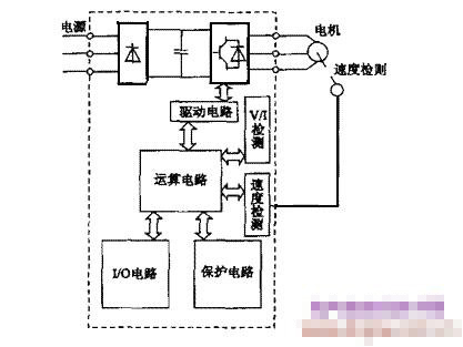 在圖 1點(diǎn)劃線內(nèi),無速度檢測(cè)電路為開環(huán)控制。在控制電路增加了速度檢測(cè)電路,即增加速度指令,可以對(duì)異步電動(dòng)機(jī)的速度進(jìn)行控制更精確的閉環(huán)控制。