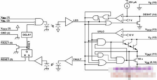 在剛剛上電的過程中,芯片供電電壓由0V逐漸上升到最大值。如果此時(shí)芯片有輸出會(huì)造成IGBT門極電壓過低,那么它會(huì)工作在線性放大區(qū)。HCPL316J芯片的欠壓鎖定保護(hù)的功能(UVLO)可以解決此問題。當(dāng)VCC與VE之間的電壓值小于12V時(shí),輸出低電平,以防止IGBT工作在線性工作區(qū)造成發(fā)熱過多進(jìn)而燒毀。示意圖詳見圖1中含UVLO部分。