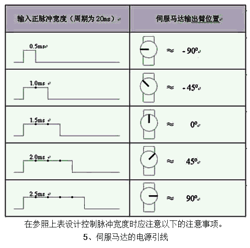 隔離(因?yàn)樗欧R達(dá)會(huì)產(chǎn)生噪音)。甚至小伺服馬達(dá)在重負(fù)載時(shí)也會(huì)拉低放大器的電壓,所以整 個(gè)系統(tǒng)的電源供應(yīng)的比例必須合理。 輸入一個(gè)周期性的正向脈沖信號(hào),這個(gè)周期性脈沖信號(hào)的高電平時(shí)間通常在1ms—2ms之間,而低電平時(shí)間應(yīng)在5ms到20ms之間,并不很嚴(yán)格,下表表示出一個(gè)典型的20ms周期性脈沖 的正脈沖寬度與微型伺服馬達(dá)的輸出臂位置的關(guān)系: 在參照上表設(shè)計(jì)控制脈沖寬度時(shí)應(yīng)注意以下的注意事項(xiàng)。