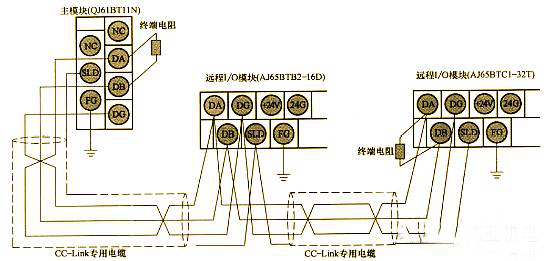 (1)CC-Link專(zhuān)用電纜連接。用CC-Link專(zhuān)用電纜連接模塊,兩端加終端電機(jī),如下圖所示。在連接前一定要斷開(kāi)電源。