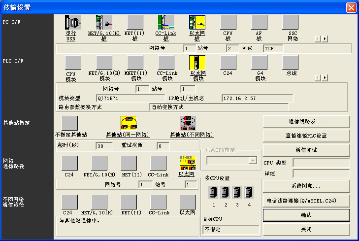 可按照實際情況選擇上圖中的“網(wǎng)絡(luò)類型”,“起始I/O號”,“網(wǎng)絡(luò)號”,“組號”,“站號”,并選擇對應(yīng)“模式”。