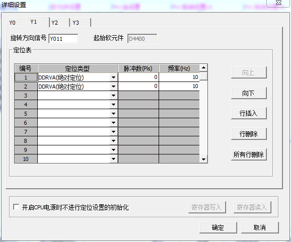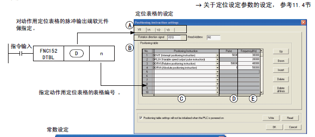 三菱PLC參數(shù)中的內(nèi)置定位設(shè)置的詳細設(shè)置中有起始軟元件,定位表中每個脈沖數(shù)和頻率的設(shè)置就從起始軟元件開始每格占2個(32位數(shù)據(jù))依次排列,修改這些軟元件的數(shù)值就可以。例如起始軟元件是D4000,那么第一個表的脈沖數(shù)就是D4000+1,頻率是D4002+1,第二個表的脈沖數(shù)是D4004+1,頻率是D4006+1,這樣依此類推。