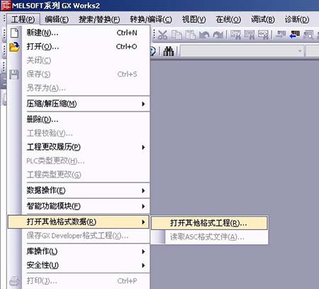 第 1 步:在 GX Works2 中,點(diǎn)工程、打開(kāi)其他格式數(shù)據(jù)、打開(kāi)其他格式工程;