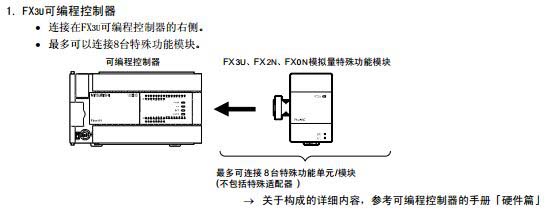 解答:三菱FX3U最多可以連接4臺(tái)模擬量特殊適配器,最多可以連接8臺(tái)特殊功能模塊,拓展方式如下圖: