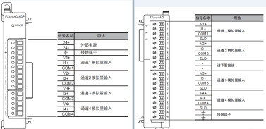 區(qū)別四:最大絕對(duì)輸入量不同,FX3U-4AD的電壓最大絕對(duì)輸入為±15V ,電流最大絕對(duì)輸入為+30mA; FX3U-4AD-ADP的電壓最大絕對(duì)輸入為-0.5V、+15V,電流最大絕對(duì)輸入為-2mA、+30mA。