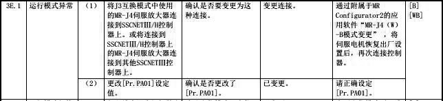 首先,可以確定的是,三菱伺服電機(jī)MR-J4系列報(bào)警“3E.1”是運(yùn)行模式異常的故障,與三菱伺服電機(jī)本身并無(wú)半毛錢(qián)的關(guān)系,具體三菱伺服報(bào)警說(shuō)明如下圖所示: