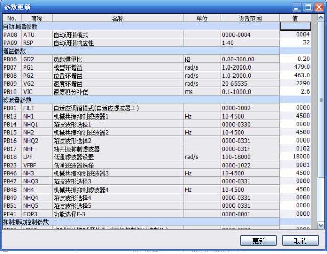 窗口中的三菱伺服參數(shù)即是伺服一鍵式調(diào)整時(shí)自動(dòng)調(diào)整的參數(shù)。