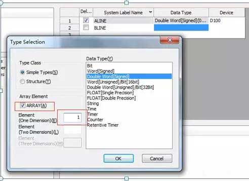 3.使用32位數(shù)據(jù)標(biāo)簽時(shí)一定要勾選數(shù)組為1維的1個(gè),筆者沒有選數(shù)組的時(shí)候測試會報(bào)f3000001 標(biāo)簽錯(cuò)誤。