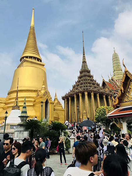 第一站:首先是到泰國必游的大皇宮與玉佛寺,游大皇宮和寺有許多的禮儀規(guī)矩,如:在入大皇宮時,不能穿拖鞋,上衣不能穿無袖下身著裝必須蓋過膝蓋,入寺廟需脫鞋等等,不過在此之前海藍的小伙伴早就做好相關(guān)的功課,當然是順利進行游玩,小編提醒:還沒去過泰國旅游的小伙伴在去泰國一定要做好相關(guān)功課,了解當?shù)亓?xí)俗文化,不然會被擋在門外喲!