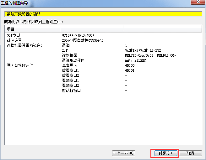 2.1.9 系統(tǒng)環(huán)境設置確認,單擊[結束],到此完成一個工程項目新建。