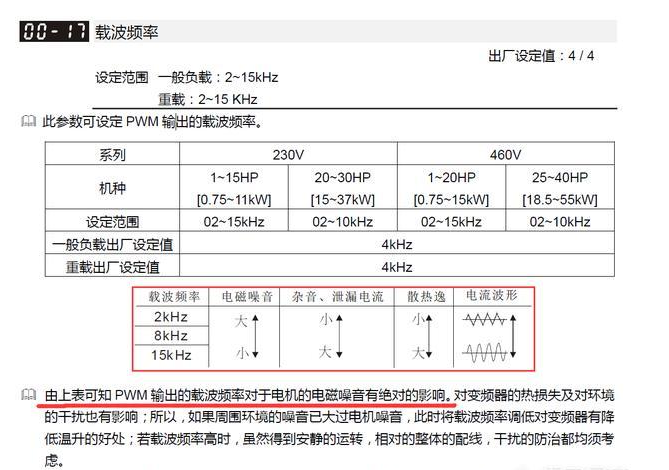 載波頻率是變頻器內(nèi)部導(dǎo)通開關(guān)管的PWM(脈沖寬度調(diào)制)頻率,它對電機的電磁噪聲有絕對的影響;
